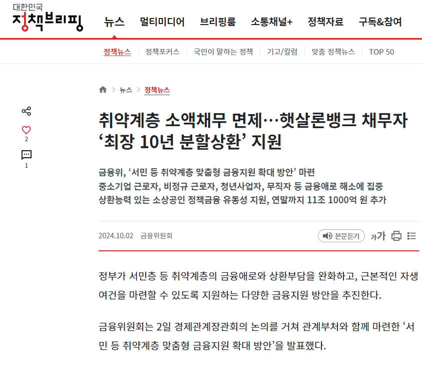 이번 10월 2일 정부에서 소액채무 면제 및 지원을 통해 취약계층의 금융애로와 상환 부담을 완화하고, 자생할 수 있는 여건을 마련할 수 있도록 금융 지원을 확대하는 방안을 추진한다고 합니다.